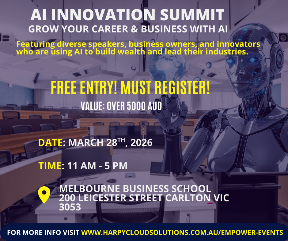 Whether you’re a small business owner, tech enthusiast, driven professional, or someone eager to stay ahead in a rapidly evolving digital world, this AI event in Melbourne will equip you with the skills, insights, and confidence to take your next big step in the future of work.